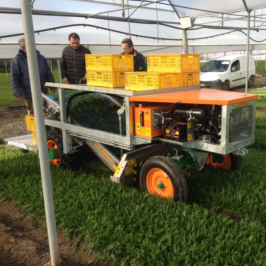 Ortomec diseña cosechadoras específicas para una amplia variedad de lechugas (romana, iceberg, radicchio, etc.), disponibles todo el año. Estas máquinas garantizan una cosecha eficiente y delicada gracias a su tecnología avanzada: una cuchilla oscilante, sensores electrónicos y una cinta de púas patentada. Además, complementan la cosecha con sistemas de monitorización y limpieza. Descubra el modelo Ortomec ideal para sus necesidades de cultivo.